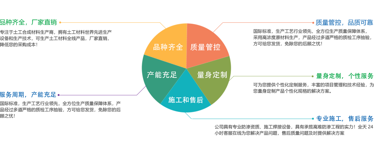 公司所有產(chǎn)品均采用國(guó)際標(biāo)準(zhǔn)組織生產(chǎn),并經(jīng)國(guó)家、市技術(shù)監(jiān)督局采標(biāo)驗(yàn)收,生產(chǎn)工藝及水平全國(guó)領(lǐng)先,屬?lài)?guó)內(nèi)優(yōu)等水平,實(shí)物質(zhì)量達(dá)到國(guó)際先進(jìn)水平。經(jīng)用戶(hù)、施工單位使用證明,質(zhì)量穩(wěn)定可靠、施工方便、價(jià)格合理、售后服務(wù)完善。產(chǎn)品主要應(yīng)用于農(nóng)業(yè)、海綿城市建設(shè)、公路、鐵路、垃圾填埋場(chǎng)防滲,水利、電力、水土保持及環(huán)境綠化與基礎(chǔ)建設(shè)領(lǐng)域,已被廣泛應(yīng)用于高速公路、鐵路、垃圾填埋場(chǎng)等多項(xiàng)國(guó)家重點(diǎn)工程,受到工程界專(zhuān)家及廣大用戶(hù)的一致好評(píng)。